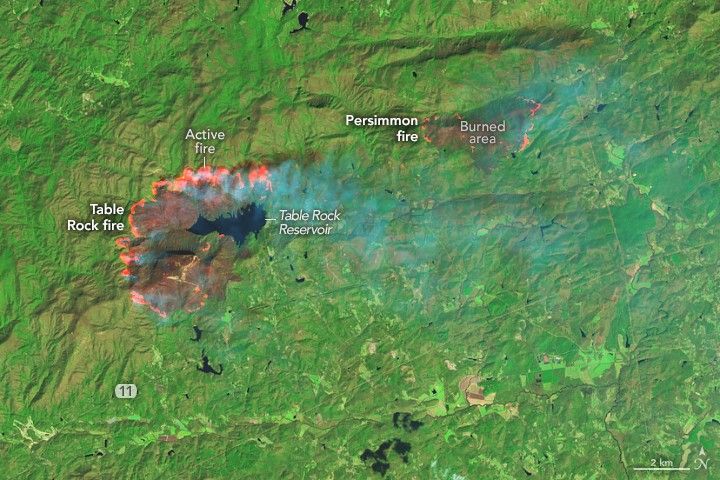 The South Carolina Forestry Commission (SCFC) reported that around the time of these images, the Table Rock fire had burned nearly 4,600 acres (18.6 square kilometers), doubling in size since the day before. Meanwhile, the Persimmon Ridge fire had burned 1,600 acres (6.5 square kilometers). By the evening of March 27, the burned areas had grown to nearly 8,700 acres and 2,000 acres, respectively, as efforts continued toward securing the fire’s perimeter and protecting structures.