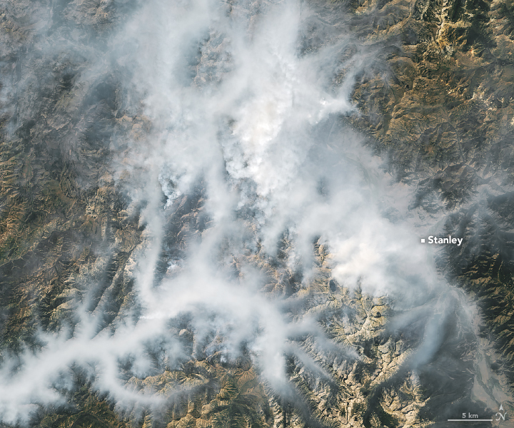 The OLI (Operational Land Imager) on Landsat 8 acquired these images of fire activity on August 31, 2024, at about 12:30 p.m. local time (18:30 Universal Time). Thick smoke fills the valleys, while plumes from active blazes drift to the north. At this point, the Wapiti fire, on the right side of the image, had reached about 95,000 acres, and its perimeter was uncontained. Fires in the Middle Fork Complex, which spanned about 55,000 acres on this date, burn on the left side of the image.