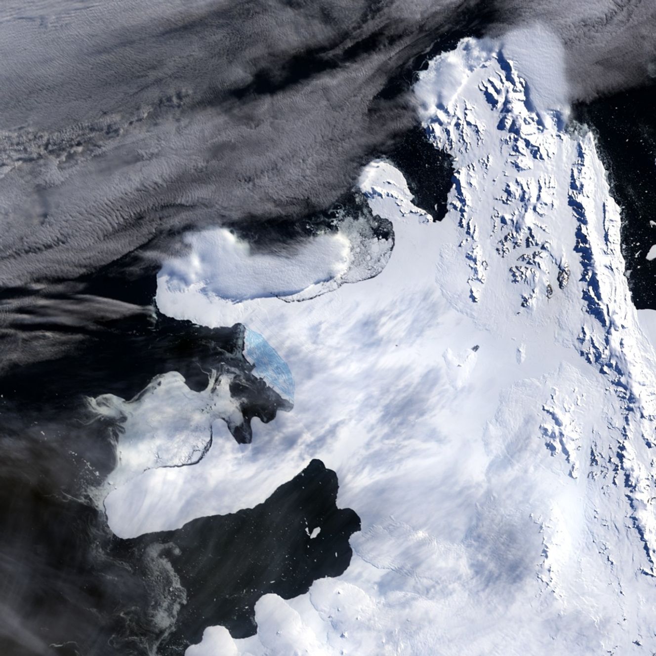 The Moderate Resolution Imaging Spectroradiometer (MODIS) sensors on NASA’s Terra and Aqua satellites provided some of the earliest evidence of the Wilkins Ice Shelf disintegration. Aqua acquired the February 28 image (top, taken at 21:10 UTC), and Terra acquired the February 29 image (bottom, 13:05 UTC). In both images, intact ice shelf appears white, and disintegrating shelf appears blue.