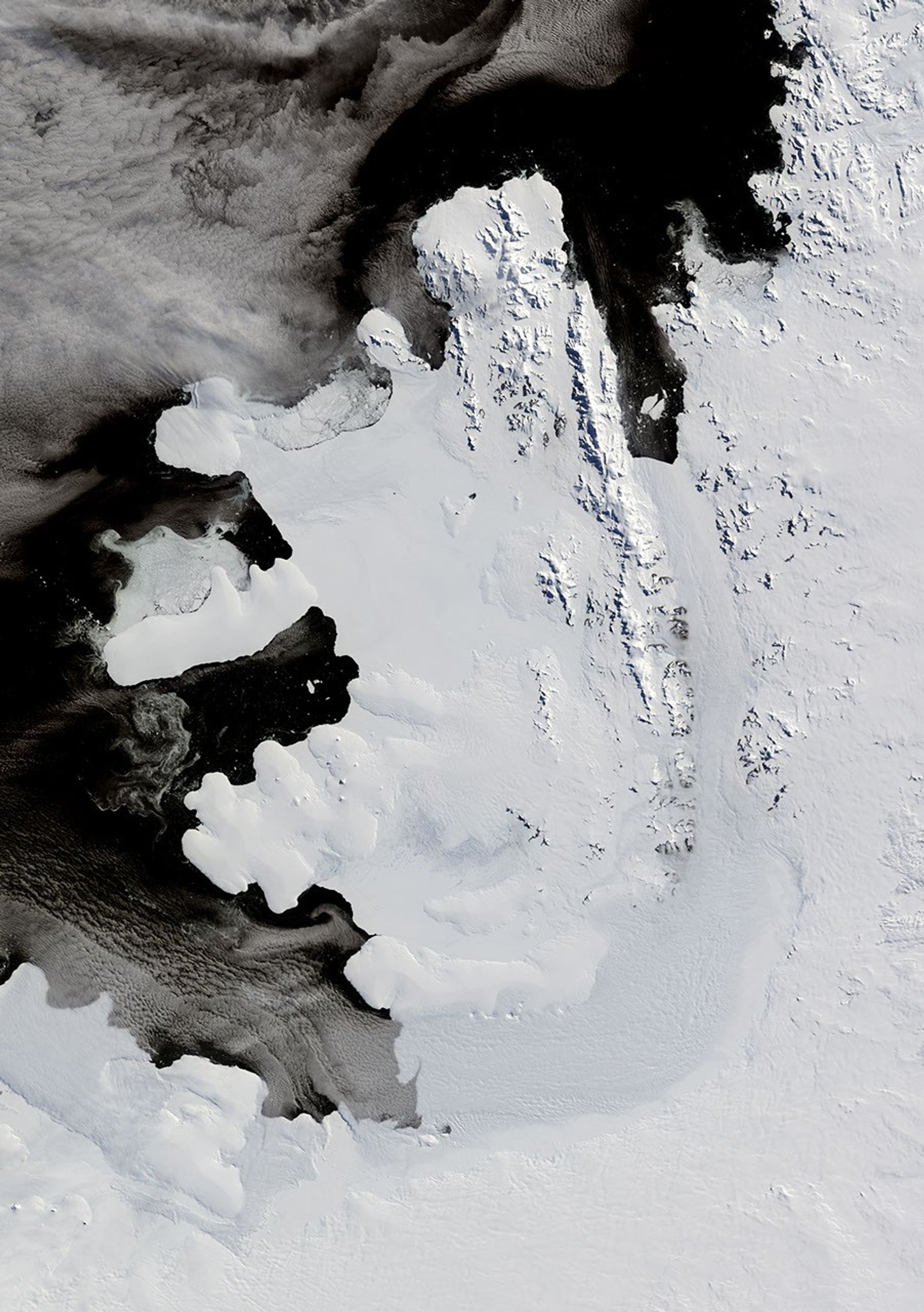 Ice shelves are thick slabs of ice that are attached to coastlines and extend out over the ocean. In the natural course of events, ice shelves often calve large icebergs. Beginning in the mid-1990s, however, some ice shelves began exhibiting a new behavior: rapid disintegration into small pieces, likely as the result of warming temperatures. On February 28, 2008, the Wilkins Ice Shelf on the Antarctic Peninsula exhibited such a phenomenon.