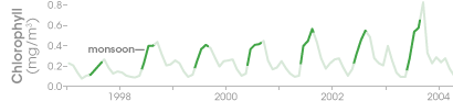 This graph shows seasonal cycles of chlorophyll (milligrams per cubic meter) in the Arabian Sea. Dark green segments show the concentrations measured during the heart of the summer monsoon.