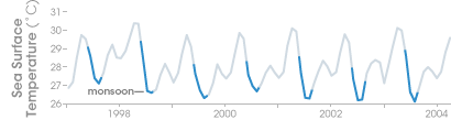 Chlorophyll concentrations in the Arabian Sea increased while sea surface temperatures decreased. This graph shows seasonal cycles in temperatures in the Arabian Sea from 1997 to mid-2004. Dark segments mark the observations collected during the heart of the summer monsoon. Falling temperatures indicate more upwelling of cold, deep water.