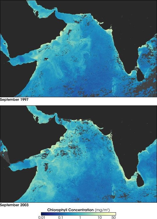 Between 1997 and 2003, chlorophyll concentrations in the Arabian Sea rose 350 percent. In the maps above, high chlorophyll concentrations are yellow, while low concentrations are dark blue.