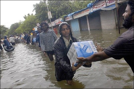 Stronger summer monsoons may mean more rain for parts of India—perhaps much more rain. On July 26, 2005, the coastal city of Mumbai endured a record 24-hour rainfall of 94.4 centimeters (37.2 inches). In this photograph, people lift bottled water over a flooded street.