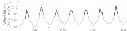 Chlorophyll concentrations in the Arabian Sea increased while sea surface temperatures decreased. This graph shows seasonal cycles in temperatures in the Arabian Sea from 1997 to mid-2004. Dark segments mark the observations collected during the heart of the summer monsoon. Falling temperatures indicate more upwelling of cold, deep water.