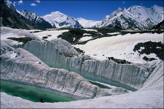 Declining snow cover and retreating glaciers in the Himalaya may reduce fresh water supplies in India, Pakistan, and Tibet. Mountain glaciers will likely continue to retreat, and their loss could destabilize mountain slopes. This photograph shows summer melt ponds on the Vigne Glacier in the Concordia region of Pakistan.