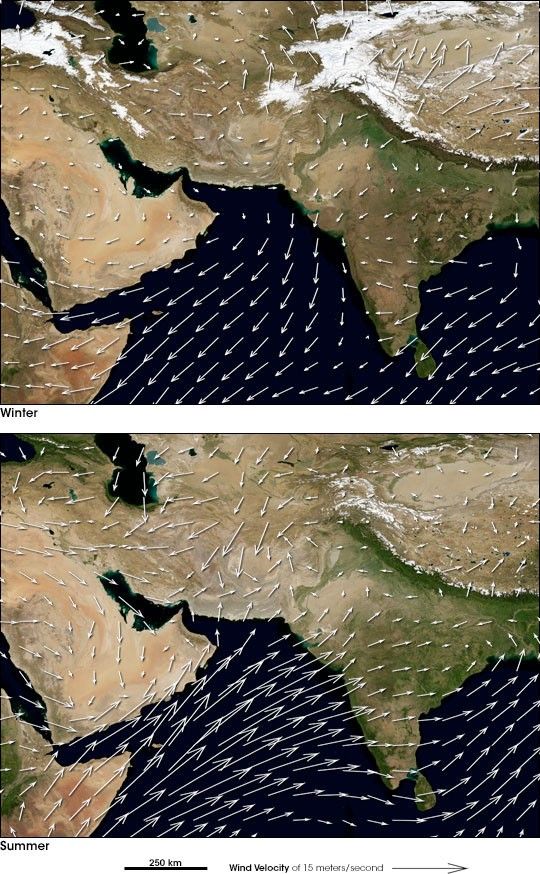 Differences in temperature between land and ocean drive the Asian monsoon. During the winter in South Asia (upper), warm air over the Arabian Sea rises, drawing cold air from the land to the north. In summer (lower), after much of the snow melts, the land warms more than the ocean, and the wind direction reverses.