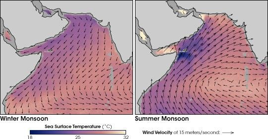 In the summer, strong and steady monsoon winds drive the surface waters in the western Arabian Sea northeast. In response, cold water wells up from the ocean depths. These maps show sea surface temperatures (color) and winds (arrows).