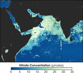 Goés and his team discovered surprisingly high concentrations of nitrate in the surface waters of the Arabian Sea. While trying to determine if his results were correct, Goés discovered a complex chain of cause and effect between climate change, Eurasian snow cover, and the plant life in the Arabian Sea. This map shows nitrate concentrations from August of 2002, with blue indicating low levels and light green signifying high levels.