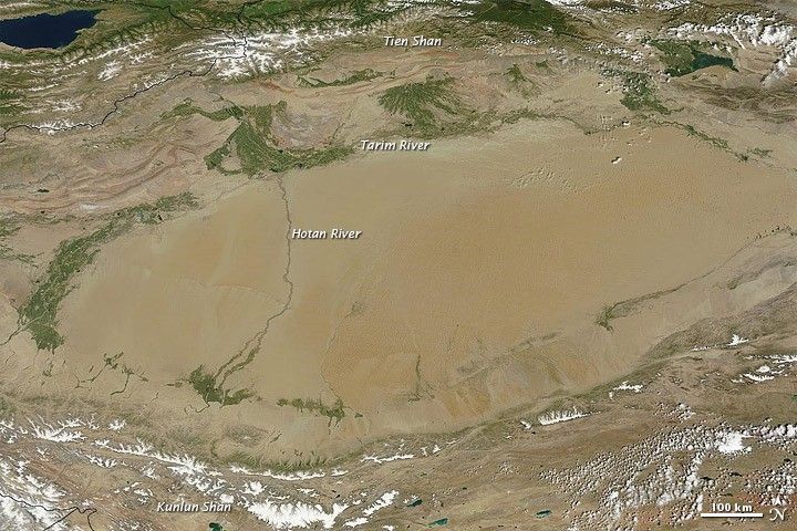 Along the basin’s northern margin, the Hotan joins the Tarim River, which links multiple areas of green in the August image. The Tarim River supplies water to an area roughly 300 miles (500 kilometers) long. Deciduous forests, filled with poplar trees, flourish nearby in the summer. The forests not only green up the edges of the Tarim Basin, they also stabilize the sandy soil and moderate the arid climate. As human settlement in the region has increased, however, some of this forest has been cleared to make way for irrigated crops.