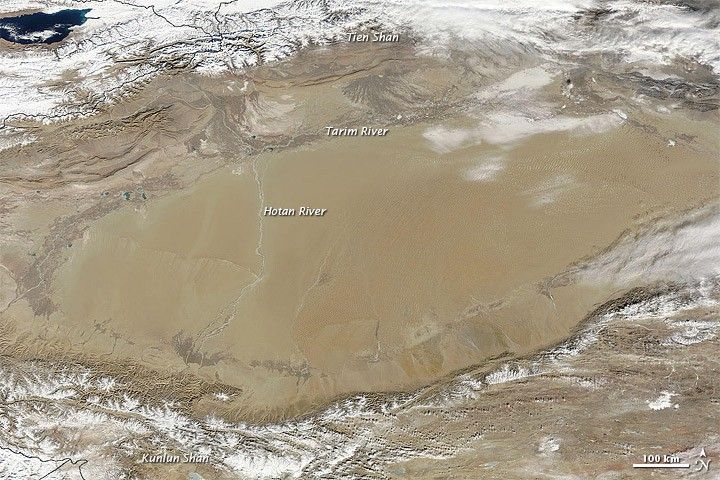 Along the basin’s northern margin, the Hotan joins the Tarim River, which links multiple areas of green in the August image. The Tarim River supplies water to an area roughly 300 miles (500 kilometers) long. Deciduous forests, filled with poplar trees, flourish nearby in the summer. The forests not only green up the edges of the Tarim Basin, they also stabilize the sandy soil and moderate the arid climate. As human settlement in the region has increased, however, some of this forest has been cleared to make way for irrigated crops.