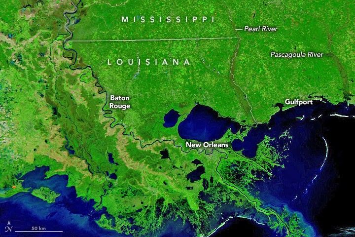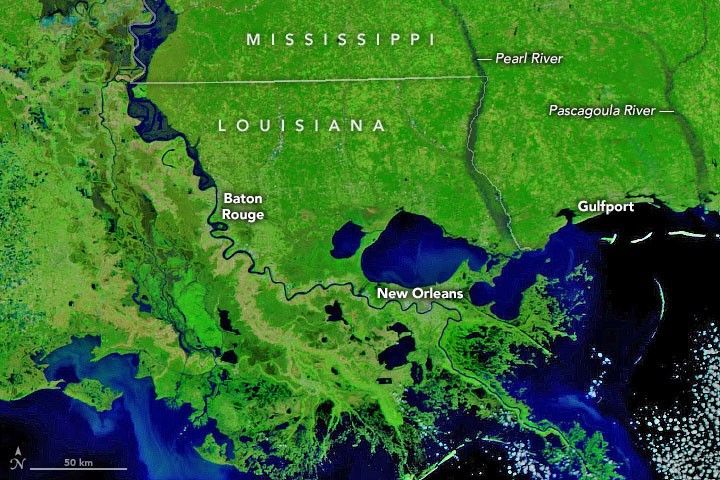 On February 27, 2020, the Visible Infrared Imaging Radiometer Suite (VIIRS) on the NOAA-NASA Suomi NPP satellite acquired an image showing high water along the lower Mississippi, Pearl, and Pascagoula rivers, among others. The second image shows more typical river conditions as they appeared on March 3, 2017. Both images use a combination of near-infrared and visible light to make it easier to see where rivers are out of their banks and spread across the floodplains. Since thick cloud cover obscured the area for the past 10 days, visible flooding had subsided somewhat before the satellite could get a clear view.