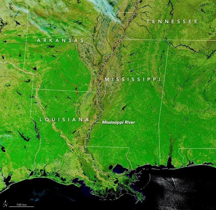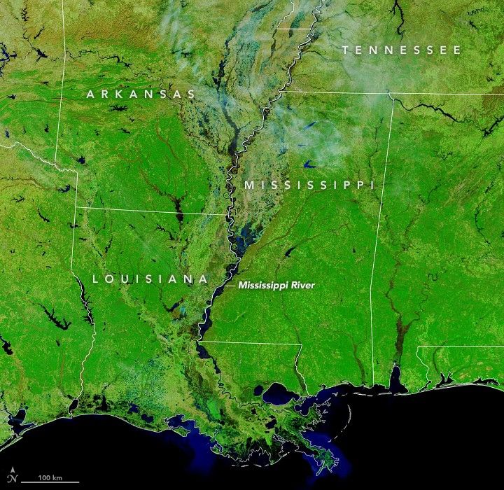 Persistent heavy rains across the Mississippi River watershed swelled the river to its banks, occasionally causing water to spill onto floodplains in late January 2020. By early February, the river was near or above flood stage in parts of Arkansas, Tennessee, Mississippi, and Louisiana, though high water has already crested in most places.