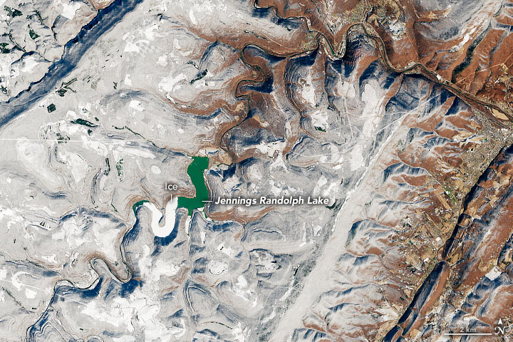 Areas to the north also received a dusting of white. This image shows Jennings Randolph Lake, located about 100 miles (160 kilometers) north of Goshen. The lake spans a 5.5-mile length of the North Branch of the Potomac River, along the border of Maryland and West Virginia. The lake formed following construction of a dam in 1982. The dam was designed to control flooding, dilute pollution downstream, supply drinking to the Washington D.C. area during drought, and provide recreation.