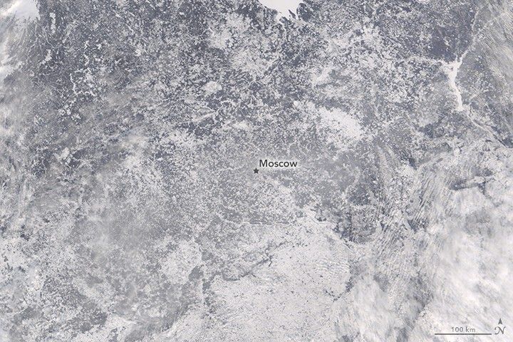 About 1500 kilometers (900 miles) to the north, Moscow and surrounding areas of Russia were also blanketed in white this week. Over a span of 36 hours on February 3–4, 2018, as much as 55 centimeters (22 inches) of snow fell around the capital city. According to news reports, the storm delivered as much snow as Moscow would typically see in an entire month. When skies cleared again on February 6, Terra MODIS acquired this view of the snowscape.