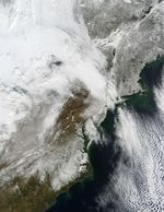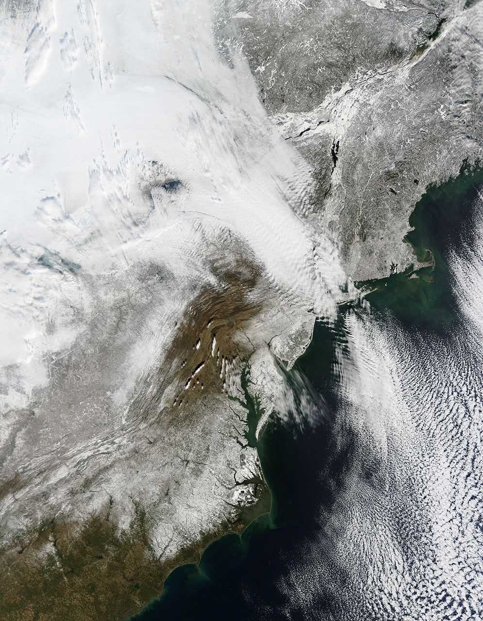 The Moderate Resolution Imaging Spectroradiometer (MODIS) on NASA’s Terra satellite captured this natural-color image of the northeastern United States and southeastern Canada on December 28, 2010. Snow and clouds blend seamlessly, but can be distinguished by their different textures. The wide swath of uniform white that extends from Michigan and Ontario toward the southeast is a cloudbank. Under clear skies, snow cover from the storm creates a mottled appearance.