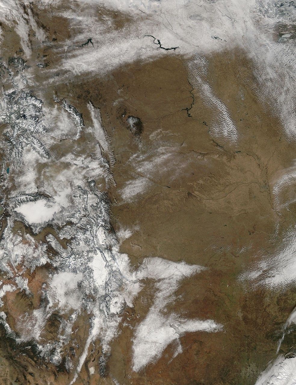 The winter storm that is snarling Thanksgiving travel in the central and eastern United States left a path of snow across the Southwest earlier in the week. The Moderate Resolution Imaging Spectroradiometer (MODIS) on NASA’s Aqua satellite acquired this image on November 26, 2013, after the clouds cleared. The National Weather Service reported snowfall totals ranging from 41 inches in Utah to 2 inches in parts of Oklahoma and Kansas. All of the states shown received significant snowfall.