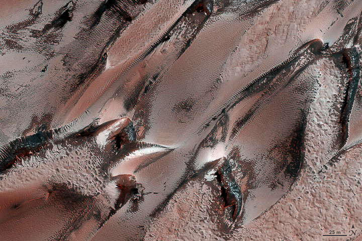 Unlike water ice on Earth, carbon dioxide ice (also known as dry ice) on Mars undergoes sublimation, meaning it turns directly into a vapor rather than a liquid when warmed. The white areas in the image are covered with ice and frost; darker areas are places where spring warming and sublimation exposed parts of the dune surface. By the Martian summer, all the ice in the area was gone.
