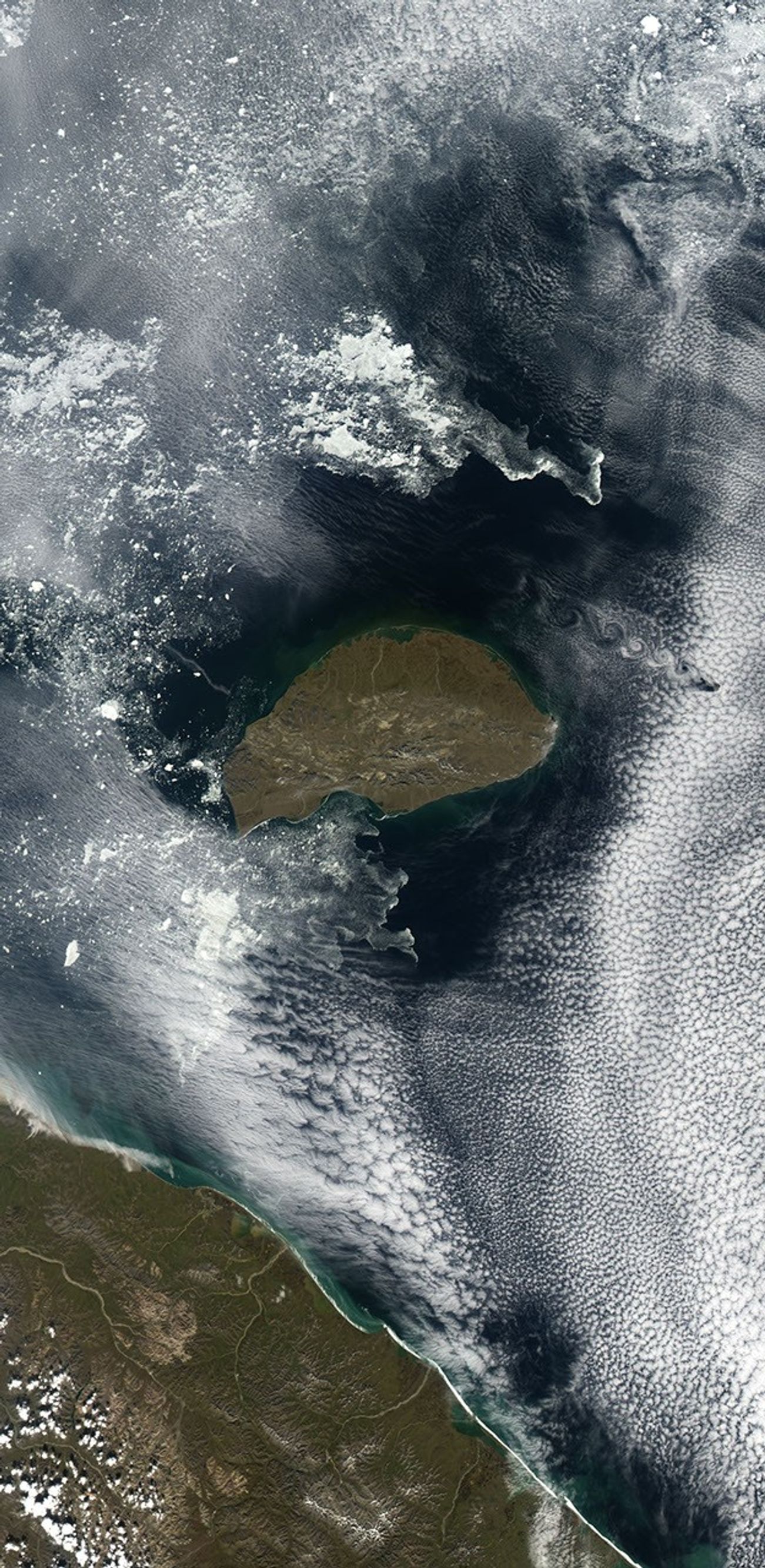 Although it looks like bare rock, this mountainous island supports diminutive Arctic tundra plants. To the east of Wrangel, along the edge of a bank of clouds, lies a much smaller landmass: Gerald, or Herald, Island. The paisley-shaped clouds flowing away from Gerald Island are Von Karman Vortices, swirling eddies caused by the island’s obstruction of air flow.