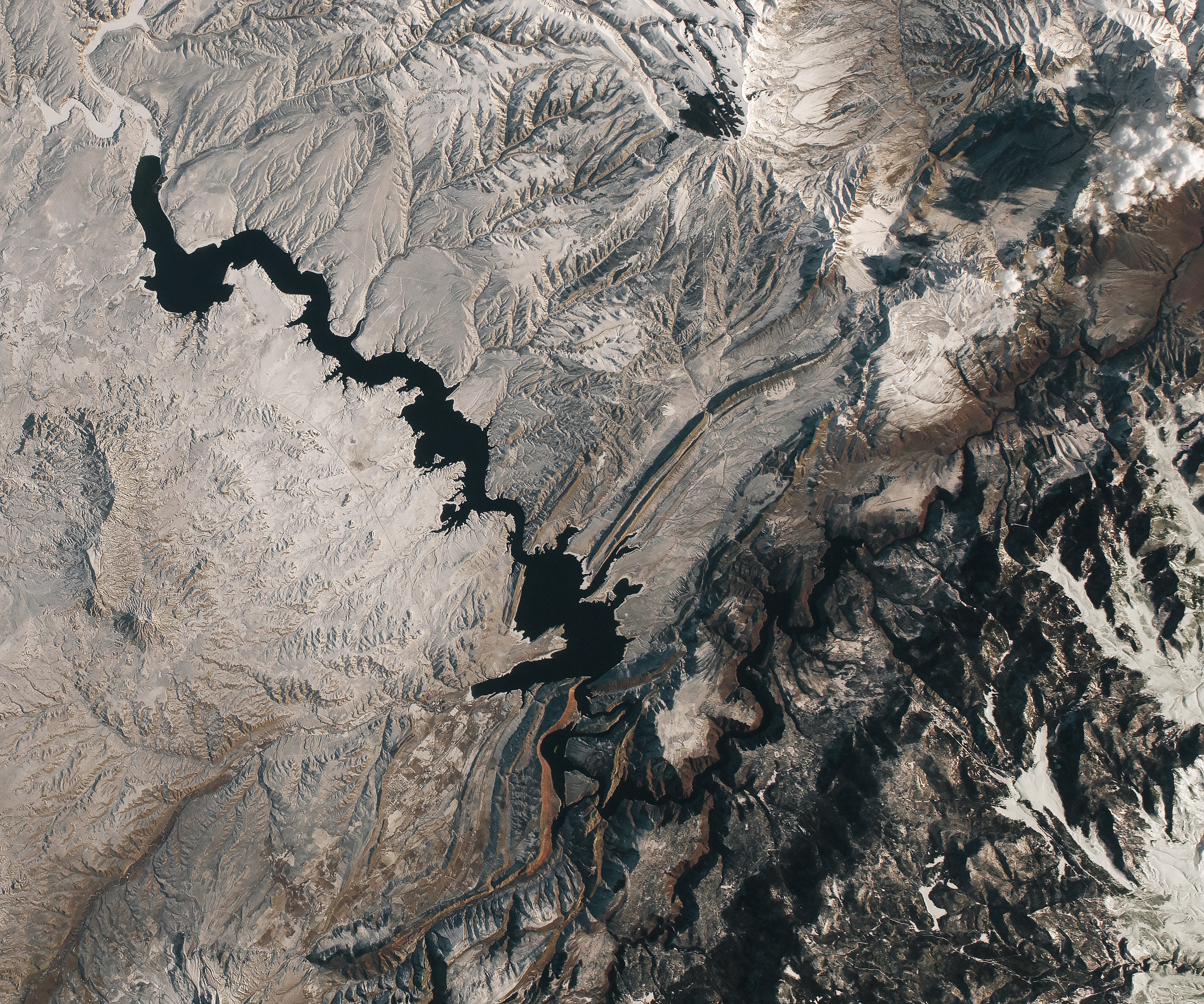 An astronaut aboard the International Space Station took this photo of the Flaming Gorge National Recreation Area, which straddles the Wyoming-Utah border. Snow blankets the mountains and high plains, highlighting the geology and landforms of the region.