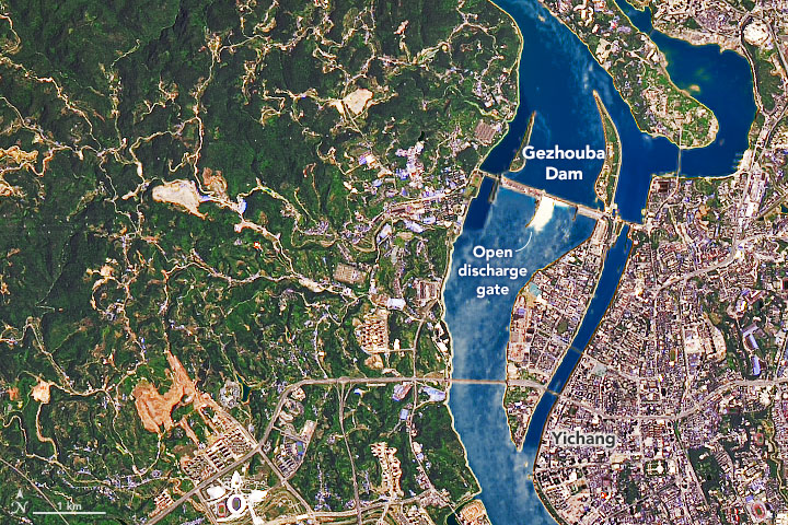 The image at the top of this page shows water moving through the gates of Three Gorges Dam. Spanning a segment of the Yangtze River in central China’s Hubei Province, the dam is 2300 meters long and stands 185 meters high. The second image shows the smaller Gezhouba Dam, located about 26 kilometers (16 miles) southeast from Three Gorges. This dam also appeared to have its spillway gates open.
