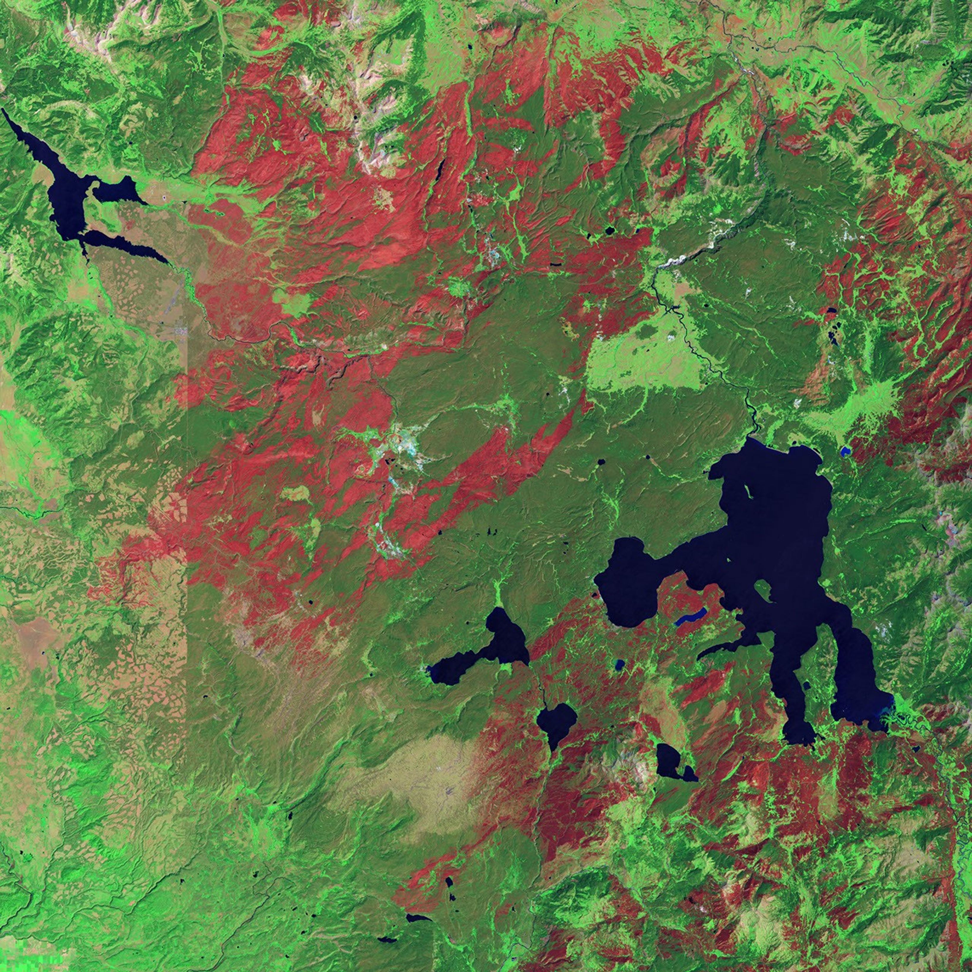 Just one year later, charred trees and grasses replaced the forests and meadows. The freshly burned land is dark red. The fire was still burning when the 1988 image was acquired on August 23. The fires glow bright pink, and a faint pall of smoke hangs over the scene. If the image had been made with visible light, to resemble what a person would see from the air, the smoke would be denser than it is in this infrared image. The smoke is blue in the infrared light.