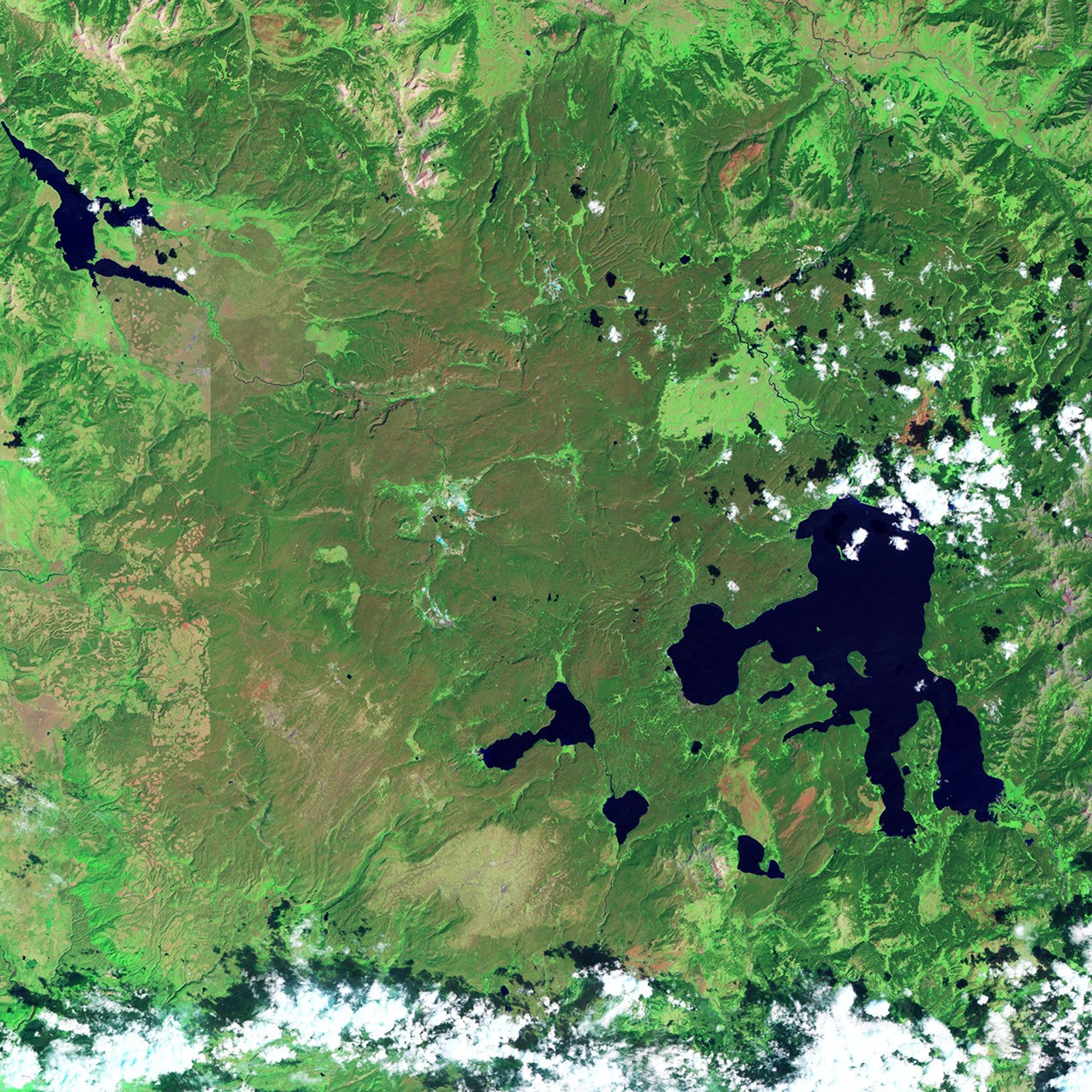 The top image, from 1987, shows the park as it had been for many years. Dense stands of tall, straight pine trees covered the high, volcanic plateau. The old forest is dark green in the image. The summertime forest is broken up by bright green, grassy river meadows and the occasional brush and grass plain, lighter green and tan. Mineral-rich geyser fields are pale blue and white, and lakes are dark blue. Beneath the green vegetation, a pinkish tinge emerges in places, which may indicate old burn scars or simply summer dormant grasses and plants.