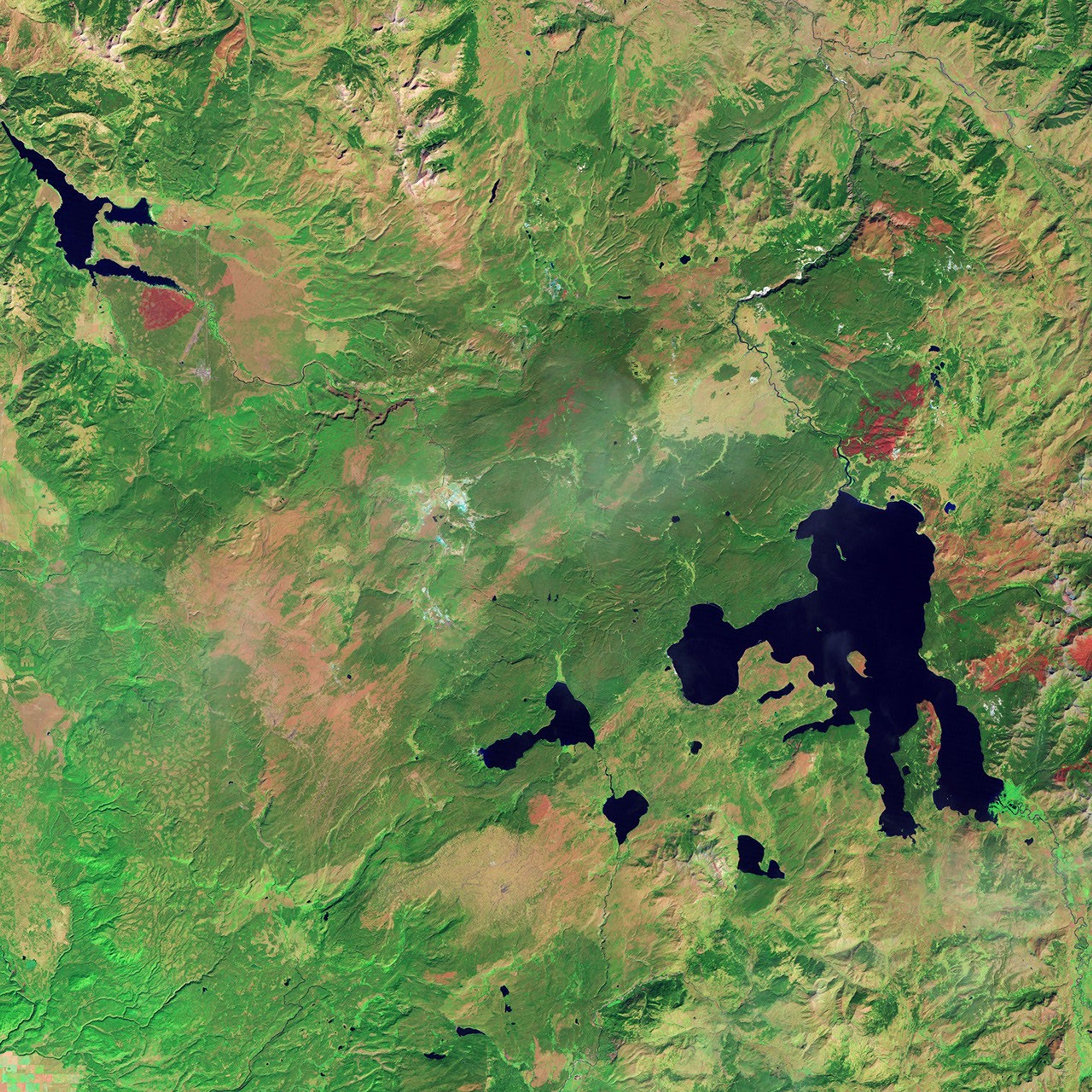 Twenty years after the fire, the burn scar was still evident, though faded to a pale, pinkish tan. By this time, new pine trees had taken root, and the forest had started to return. The new trees grow more quickly (photosynthesize at a faster rate) than older, mature forests. Because they use and reflect sunlight differently than older forests, the new trees are lighter in color in the 2008 image. Fingers of new forest are most evident intruding into the narrow strip of burned land on the right edge of the image. Forests are likely returning elsewhere as well, but the small trees do not produce a dense enough canopy to show up well in the image.