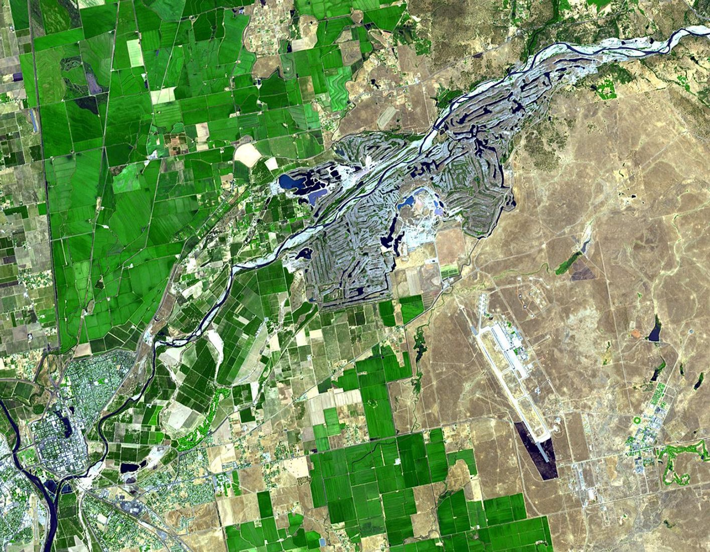This image from the Advanced Spaceborne Thermal Emission and Reflection Radiometer (ASTER) aboard NASA’s Terra satellite shows the Yuba River Goldfields on August 29, 2001. The long gray shapes are hills of gravel interspersed with blue ponds. Bright green fields dominate the terrain on the west side of the image, while barren, non-irrigated land is to the east.