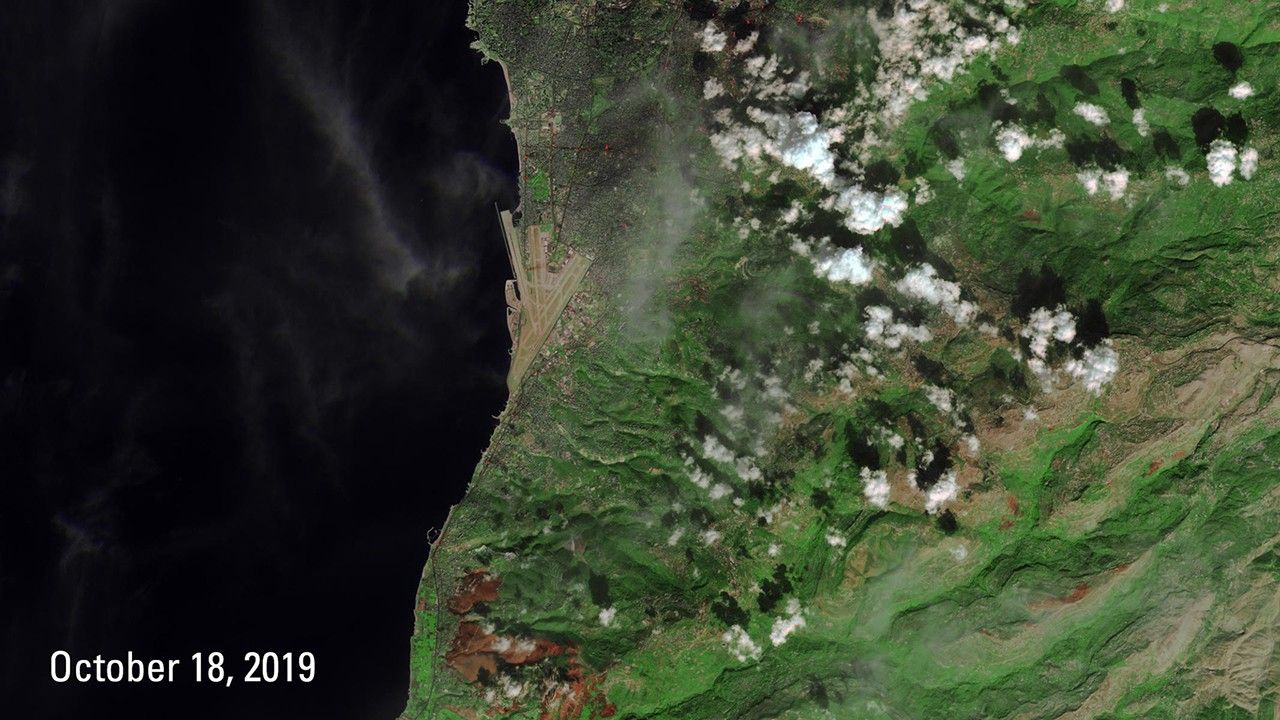 The Oct. 8 image shows a portion of Lebanon before the wildfires of mid-October 2019. The burn scars they left are visible as brown patches at the bottom of the Oct. 18 image. North of the scars is Beirut, the country's capital, where protesters set numerous fires, seen in the later image as red dots. Images taken by the European Space Agency's Sentinel-2A satellite. Source: U.S. Geological Survey’s National Land Imaging Image Collections