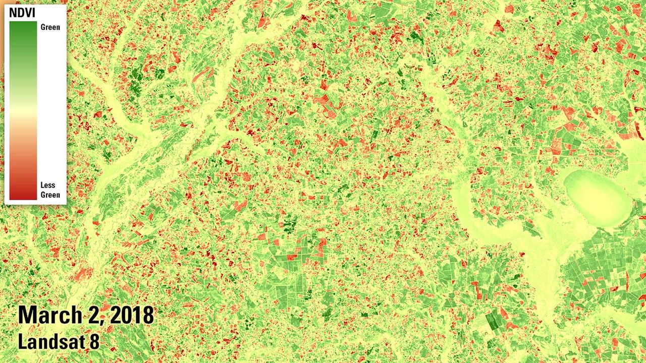 In much of the U.S., spring began unusually early in 2020. These images compare an area near the border of North and South Carolina in early March of 2018 and 2020. In the latter year, the area saw its earliest eruption on record of leaves and flowers. The two images wouldn't look very different in natural color. But in these false-color images, made from both visible and infrared light, springtime vegetation is highlighted with darker and more widespread shades of green. Images taken by the Landsat 8 satellite. Source: U.S. Geological Survey’s National Land Imaging Image Collections