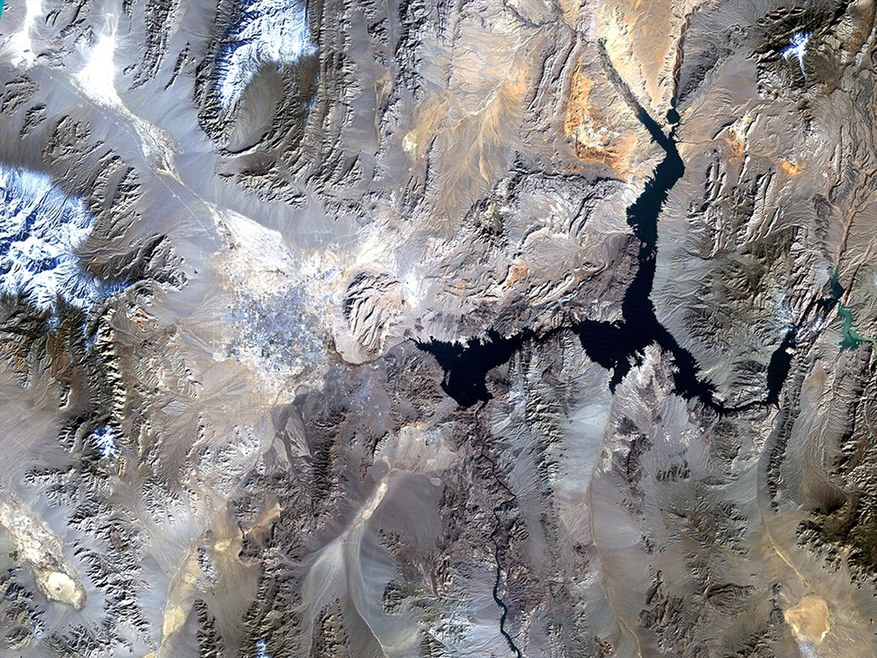 Lake Mead is one of the largest reservoirs in the world, supplying water to California, Arizona, Nevada and Mexico, including the water-guzzling Las Vegas. Through dam turbines, the lake also provides power to Nevada, southern California and northern Mexico. Since 2000, the water level has been dropping at a fairly steady rate due to lower-than-average snowfall and over a decade of drought, and as of July 2010, the lake was at 38 percent of its capacity. Water supply has been further diminished by the drawing off of water from upstream reservoirs in the upper Colorado River Basin which, historically, has been the source for the Lake Mead Reservoir. Also see this image pair of Lake Mead. Images taken by the Thematic Mapper sensor onboard Landsat 5. Source: U.S. Geological Survey (USGS) Landsat Missions Gallery, "Lake Mead, Nevada," U.S. Department of the Interior / USGS.