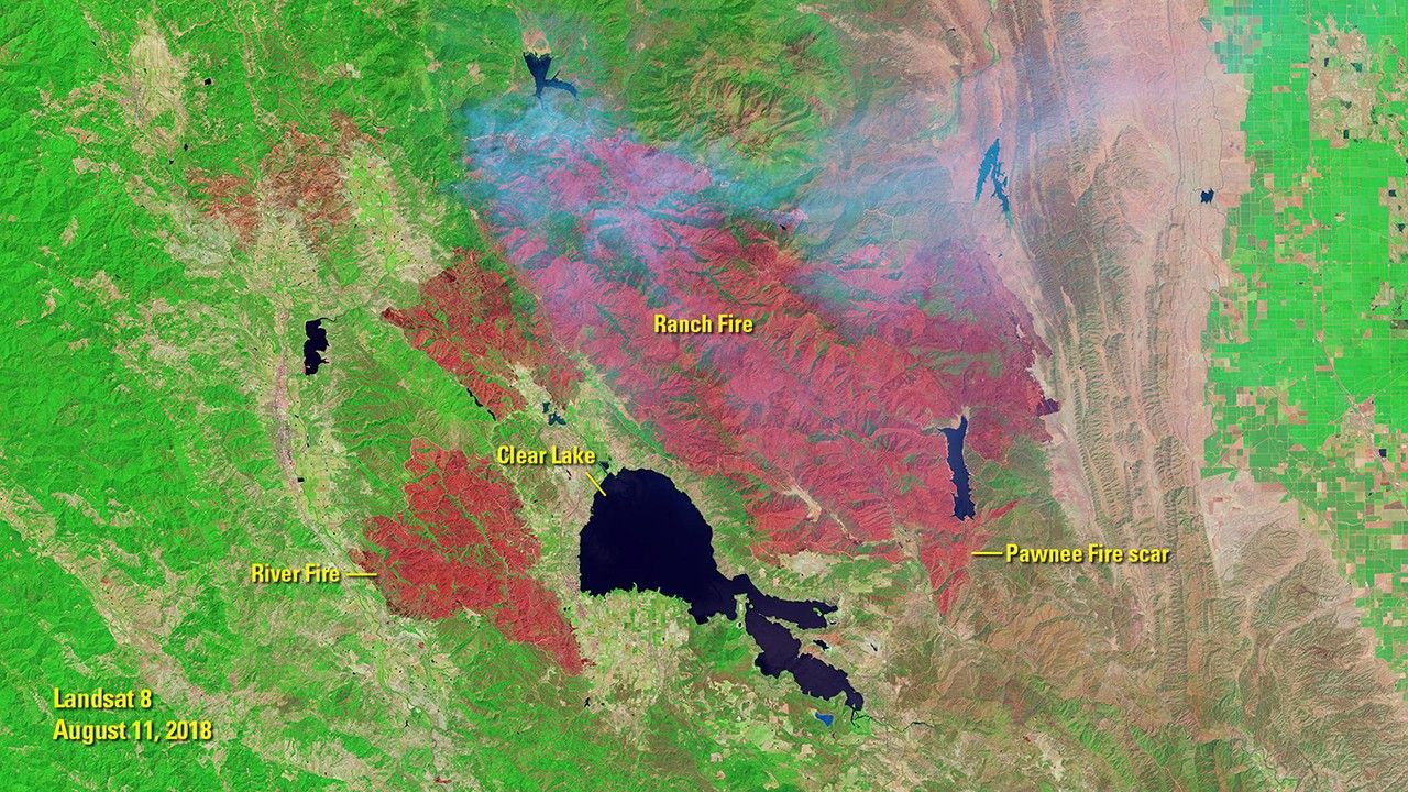 The 2018 Ranch and River fires in Northern California are known jointly as the Mendocino Complex fire, the largest wildfire since reliable record-keeping in California began in 1932. The July image was taken the day before the fires broke out. (The reddish burn scar visible in that image is from the Pawnee fire of late June 2018.) Under hot, dry, windy conditions, the Ranch and River fires spread rapidly, burning more than 328,000 acres by the time of the August image and some 459,000 acres in all. Images taken by Landsat 8. Source: U.S. Geological Survey’s National Land Imaging Image Collections and California Department of Forestry and Fire Protection (CAL FIRE).