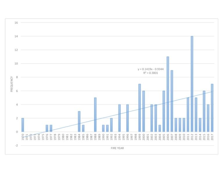 The map here shows the locations of repeated fire activity. While you can’t see it at this map’s resolution, some areas have experienced as many as 11 fires since 1950. In those areas, fires occurred about every seven years, said Weber, which is about the amount of time it takes for an ecosystem to build up enough vegetation to burn again.