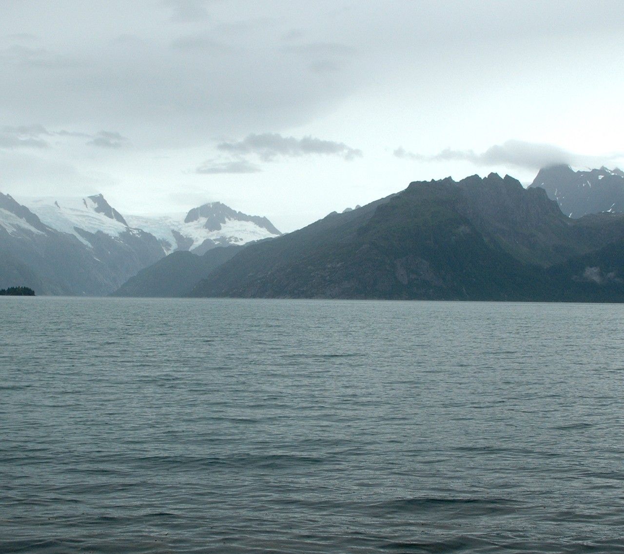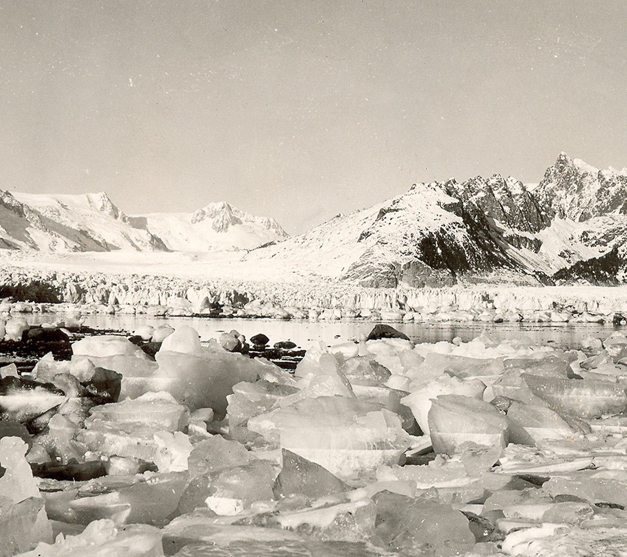 Looking north from the west shoreline of Harris Bay, Kenai Fjords National Park, Kenai Mountains, Alaska. The rocky shoreline in the foreground is covered by small icebergs, calved by the retreating Northwestern Glacier. During the roughly 60 to 80 years between photographs, Northwestern Glacier retreated some 6 miles (10 kilometers) to the northwest, out of the field of view. U.S. Geological Survey, Department of the Interior. Earlier image is from a postcard, photographer unknown, courtesy of Kenai Fjords National Park. Later image is a USGS photograph by Bruce F. Molina.