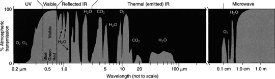 In contrast to the absorption bands, there are areas of the electromagnetic spectrum where the atmosphere is transparent (little or no absorption of radiation) to specific wavelengths. These wavelength bands are known as atmospheric "windows" since they allow the radiation to easily pass through the atmosphere to Earth's surface.