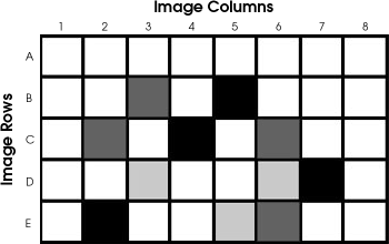 For example, consider an image that is made up of 8 columns by 5 rows of pixels. In this figure, four shades are present: black, dark gray, light gray and white. The darkest point is assigned the binary number 00, dark gray as 01, light gray as 10, and the brightest part the binary number 11. We therefore have four pixels (B5, C4, D7 and E2) that the spacecraft says are 00. There are three dark gray pixels (B3, C2, C6 and E6) assigned the binary number 01, three light gray pixels (D3, D6 and E5) that are binary number 10, and 29 white pixels are assigned the binary number 11.