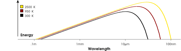 The amount of electromagnetic radiation an object emits depends primarily on its temperature. The higher the temperature of an object, the faster its electrons vibrate and the shorter its peak wavelength of emitted radiation. Conversely, the lower the temperature of an object, the slower its electrons vibrate, and the longer its peak wavelength of emitted radiation. This concept can be shown by gripping the end of a long rope and shaking it. Rapidly shaking the rope (high temperature) results in a series of short waves travelling along it, while shaking it slowly (low temperature) results in a series of longer waves.