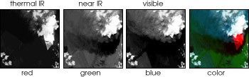Similar to the screen on a color television set, computer screens can display three different images using blue light, green light and red light. The combination of these three wavelengths of light will generate the color image that our eyes can see. This is accomplished by displaying black and white satellite images corresponding to various bands in either blue, green, or red light to achieve the relative contrast between the bands. Finally, when these three colors are combined, a color image—called a "false color image"—is produced (it's called "false color" because colors are assigned that we can see and easily interpret with our eyes).