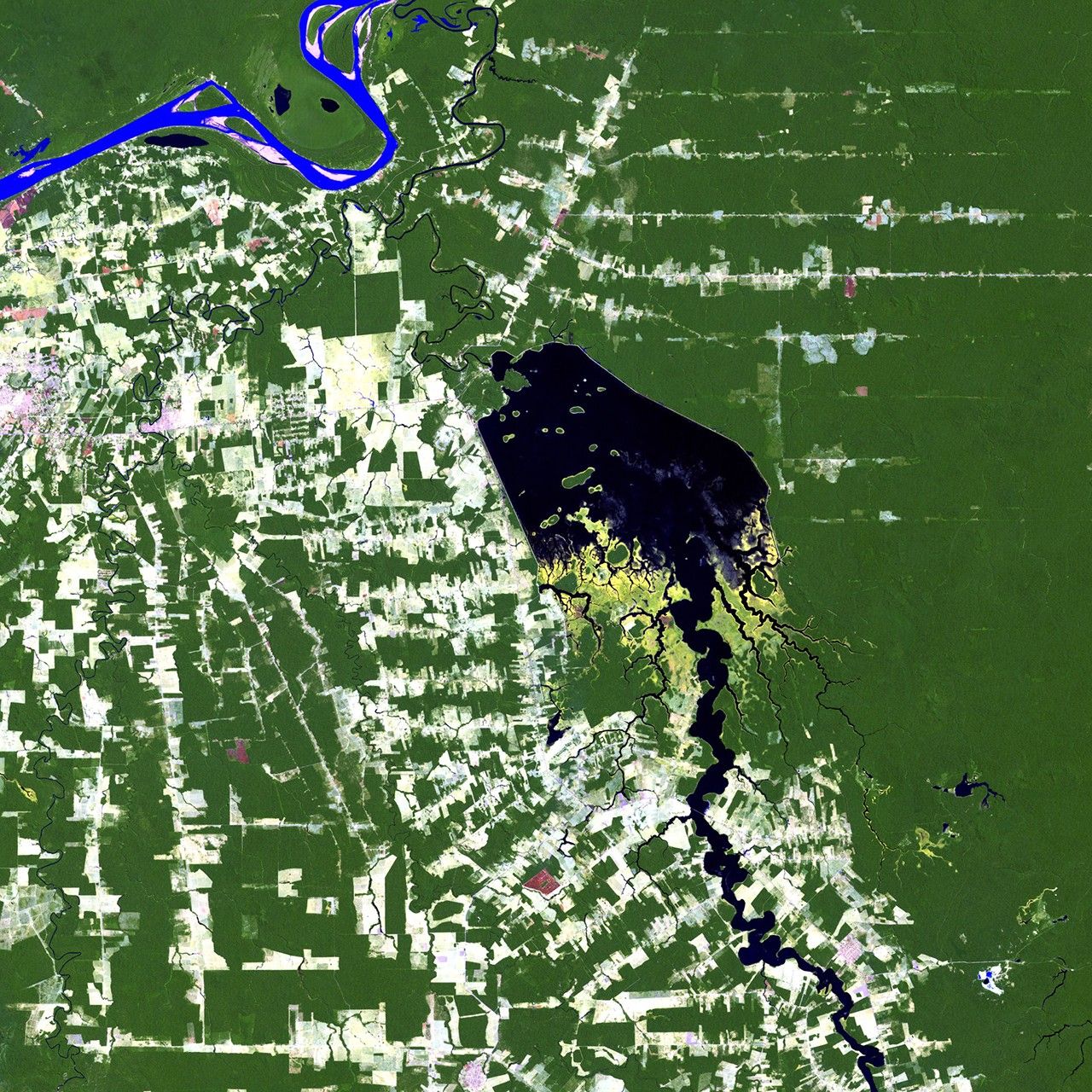 The Samuel Dam is located along the Jamari River in Rondonia, Brazil. These images show the area in 1984, shortly after construction of the hydroelectric dam began, and in 2011. The reservoir created by the dam flooded the upstream forest and displaced many people. Also evident in the images is the deforestation that has affected much of the region. Images taken by the Thematic Mapper sensor aboard Landsat 5. Source: USGS Landsat Missions Gallery, "Samuel Dam, Rondonia, Brazil," U.S. Department of the Interior / U.S. Geological Survey.