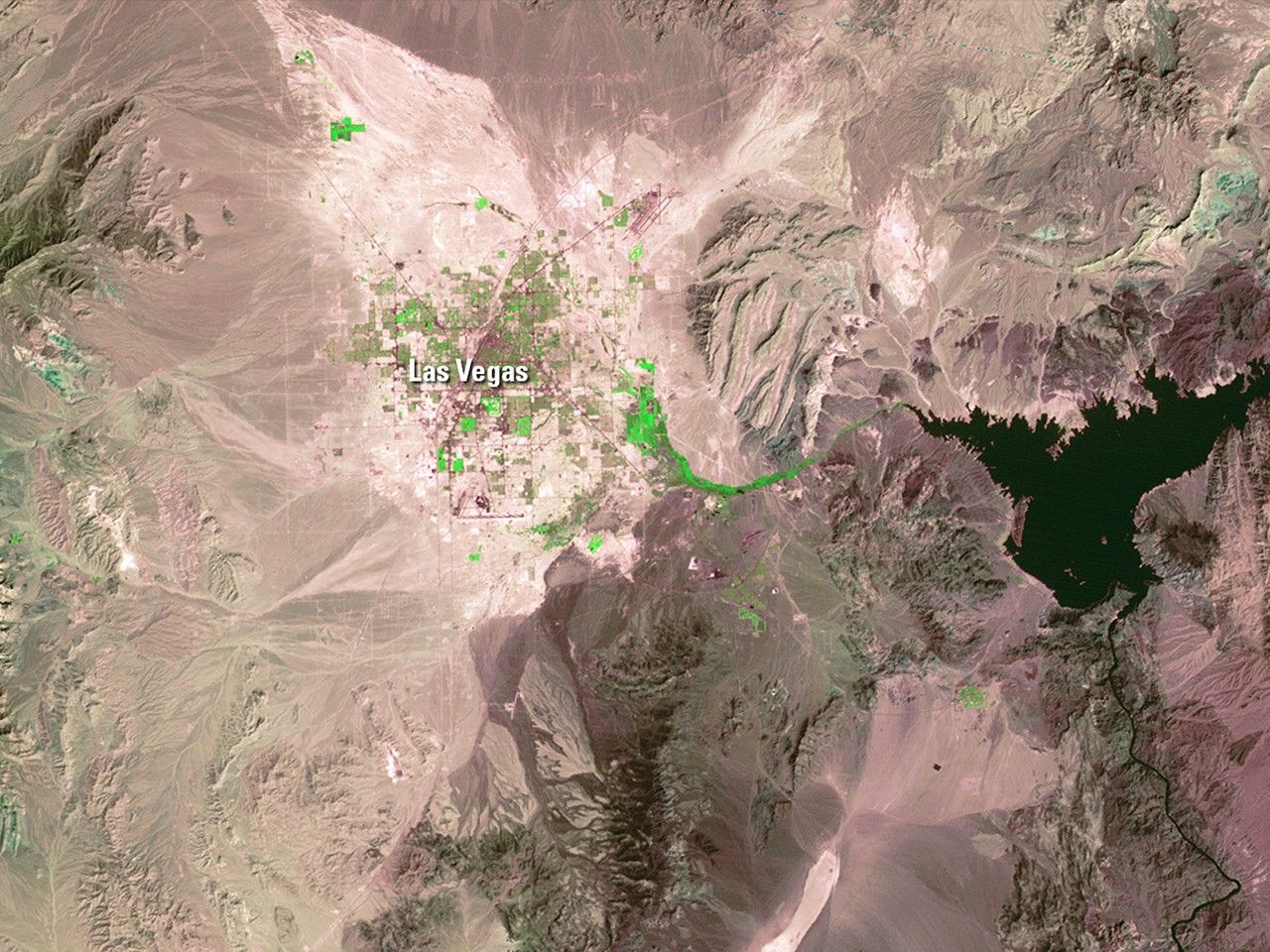 Las Vegas, Nevada, is one of the fastest growing metropolitan areas in the United States. Its population of about 2.2 million in 2017 was more than eight times the 1972 population. In these images, urban development appears green and purple. 1972 image taken by Landsat 1. 2018 image taken by Landsat 8. Source: U.S. Geological Survey’s Land Remote Sensing Image Collections.