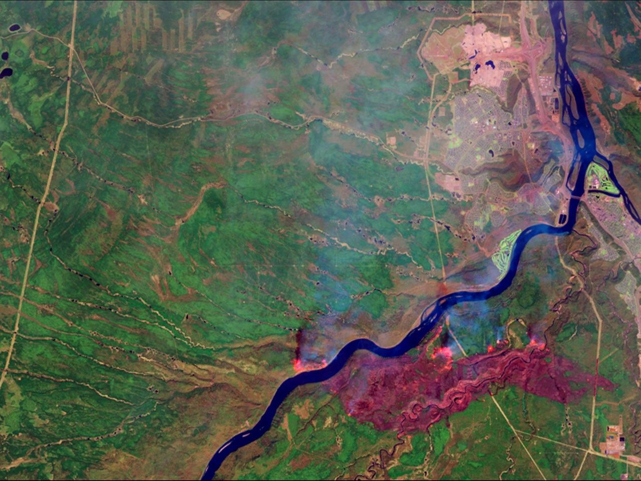 A massive wildfire near Fort McMurray in Alberta, Canada, destroyed at least 1,600 structures and forced the largest evacuation on record in Canada, involving more than 88,000 people. By May 5, fire had consumed almost 210,000 acres. The false-color images in the May picture depict active hot spots as bright orange, the burned area as dark red and smoke as hazy blue. This location is home to the Athabasca oil sands, the largest known reservoir of crude bitumen in the world. Images taken by the Operational Land Imager onboard Landsat 8. Source: U.S. Geological Survey (USGS) Landsat Missions Gallery; Wildfire Forces Evacuations in Fort McMurray, Alberta; U.S. Department of the Interior / USGS and NASA.