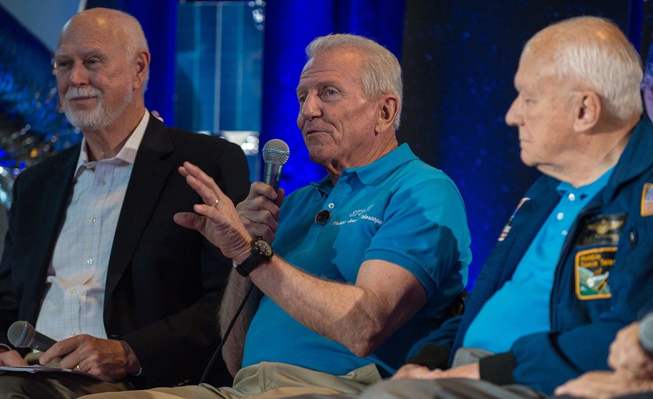 Hubble 25th Anniversary Astronaut PanelAstronauts discussed their experiences servicing Hubble during a 25th anniversary event at the Smithsonian's Udvar-Hazy Center in Virginia on April 25, 2015.Former NASA astronaut Loren Shriver, commander of STS-31, center, speaks as part of a panel discussion at an event celebrating...Jim Crocker, head of Civil Space at Lockheed Martin, moderates a panel discussion as part of an event celebrating the...A Hubble Space Telescope patch is seen on the flight jacket of former NASA astronaut Bruce McCandless during at event...