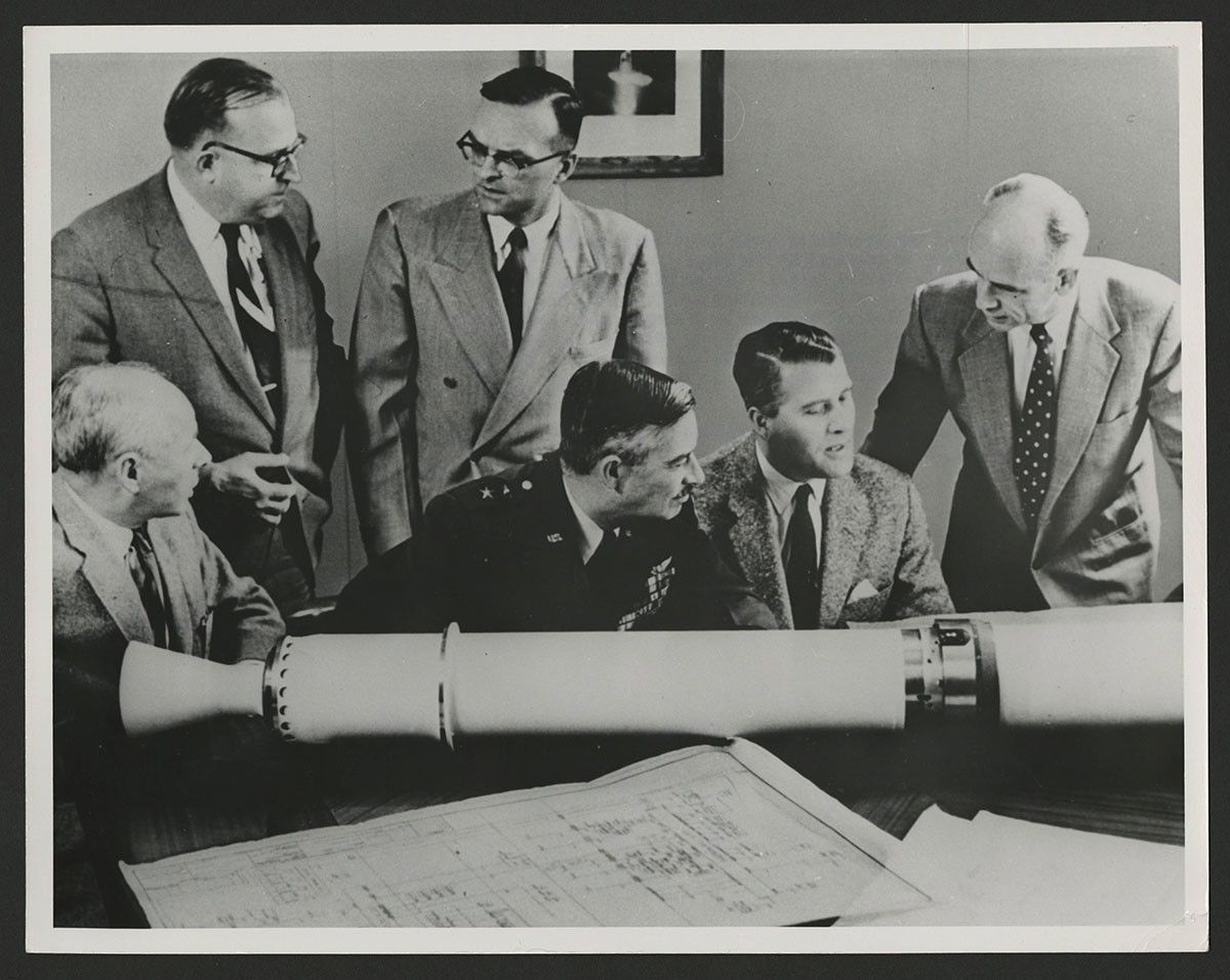 This U.S. Army photograph from 1958 shows an actual-size (80.75 inches) prototype of Explorer 1 being examined by project officers at the Army Ballistic Missile Agency in Huntsville, Alabama. The model shows the assembled satellite and the final stage rocket, which orbited together as a single unit. From left to right: (front) Eberhard Rees, Major General John B. Medaris, Wernher von Braun and Ernst Stuhlinger; (back) W. A. Mrazek, and Walter Haeussermann.