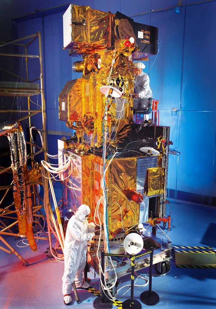 Landsat 7 spacecraft modules undergoing final integration and testing in a cleanroom facility prior to launch.