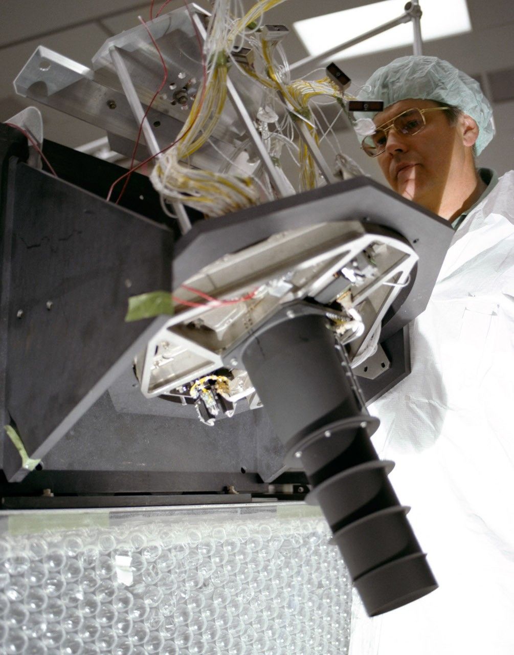 Technician in clean room gear examining a Landsat 4 instrument assembly with exposed wiring and optical components.