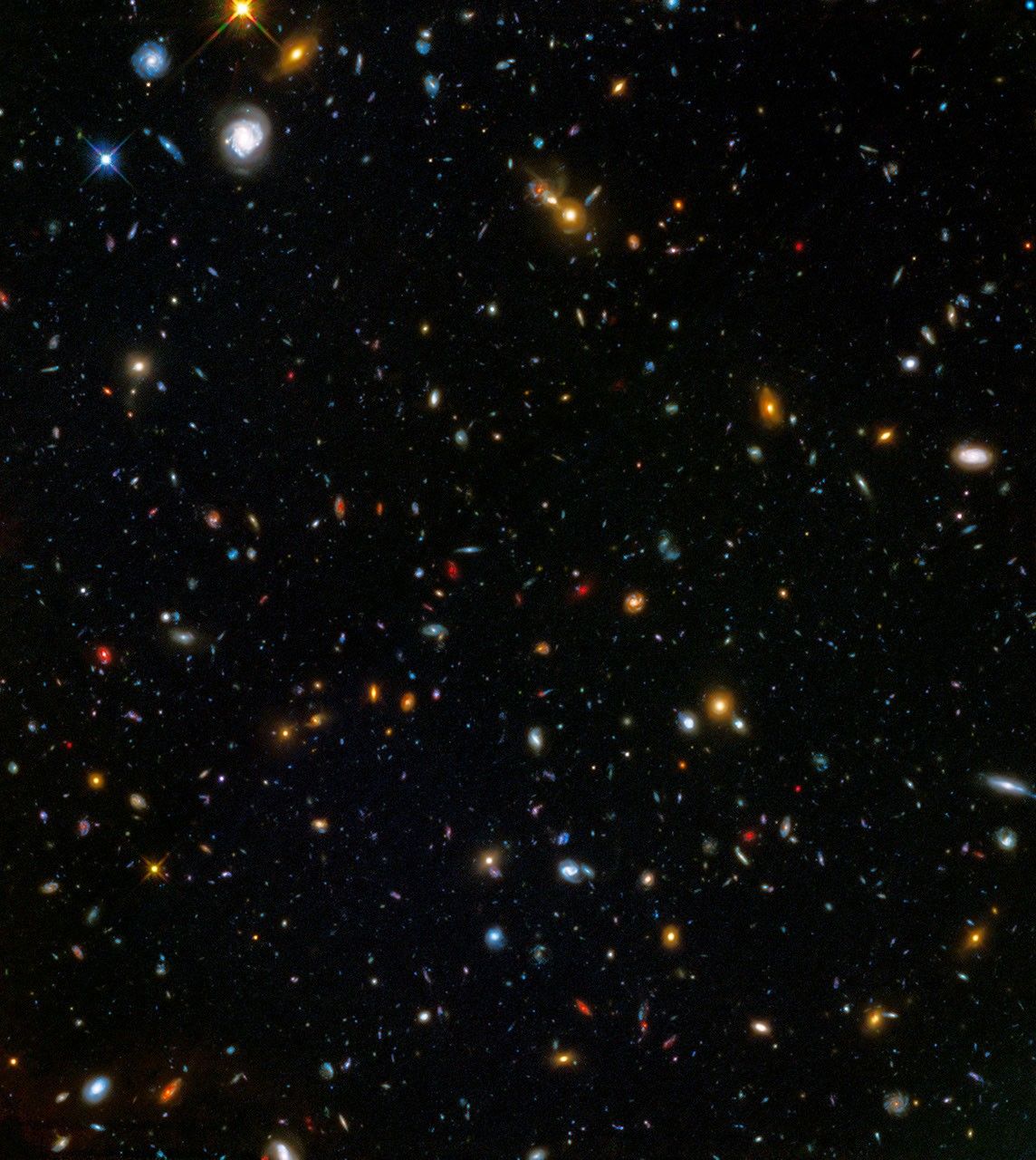 This Hubble Space Telescope view of a random patch of sky reveals how the universe looks at large: a "wallpaper" of innumerable galaxies spread across space and time. They offer a wide assortment of majestic star cities that vary in age, shape, and stellar populations. It’s a narrow view down a corridor that stretches back in time for billions of years. The wide range of rich colors comes from the fact that this snapshot is assembled from images taken in visible light as well as near-infrared light. The reddest objects in the image are presumably the farthest galaxies, whose light has been stretched into the red part of the spectrum by the expansion of space. The yellow objects are massive football-shaped elliptical galaxies that contain older stellar populations. The blue galaxies are disk-shaped pinwheels of ongoing star formation. The entire field is peppered with much smaller, fragmentary, blue galaxies – the "building blocks" ancestors of majestic spiral galaxies like our Milky Way.