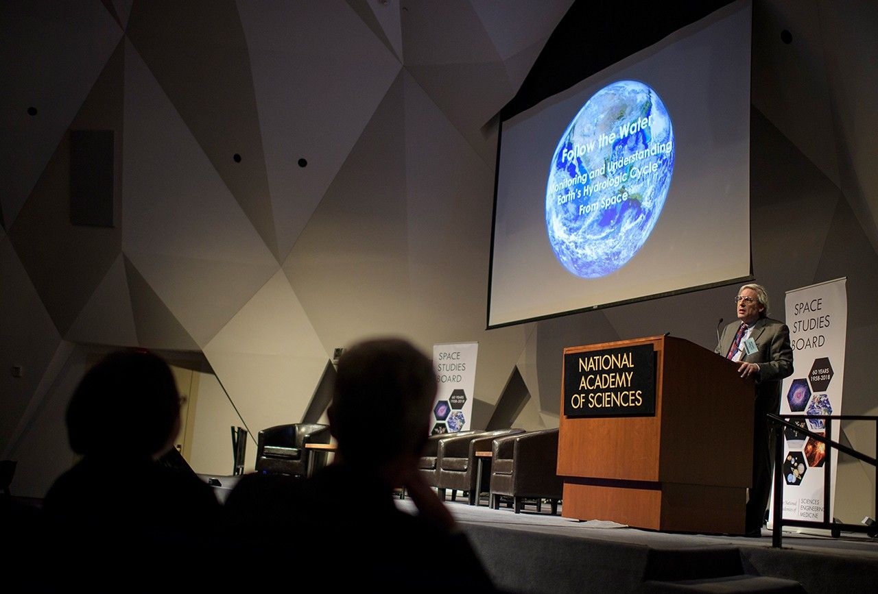 A wide shot from the perspective of the stage at the National Academy of Sciences shows Michael Freilich, Director of NASA's Earth Science Division, addressing a large audience from a wooden podium