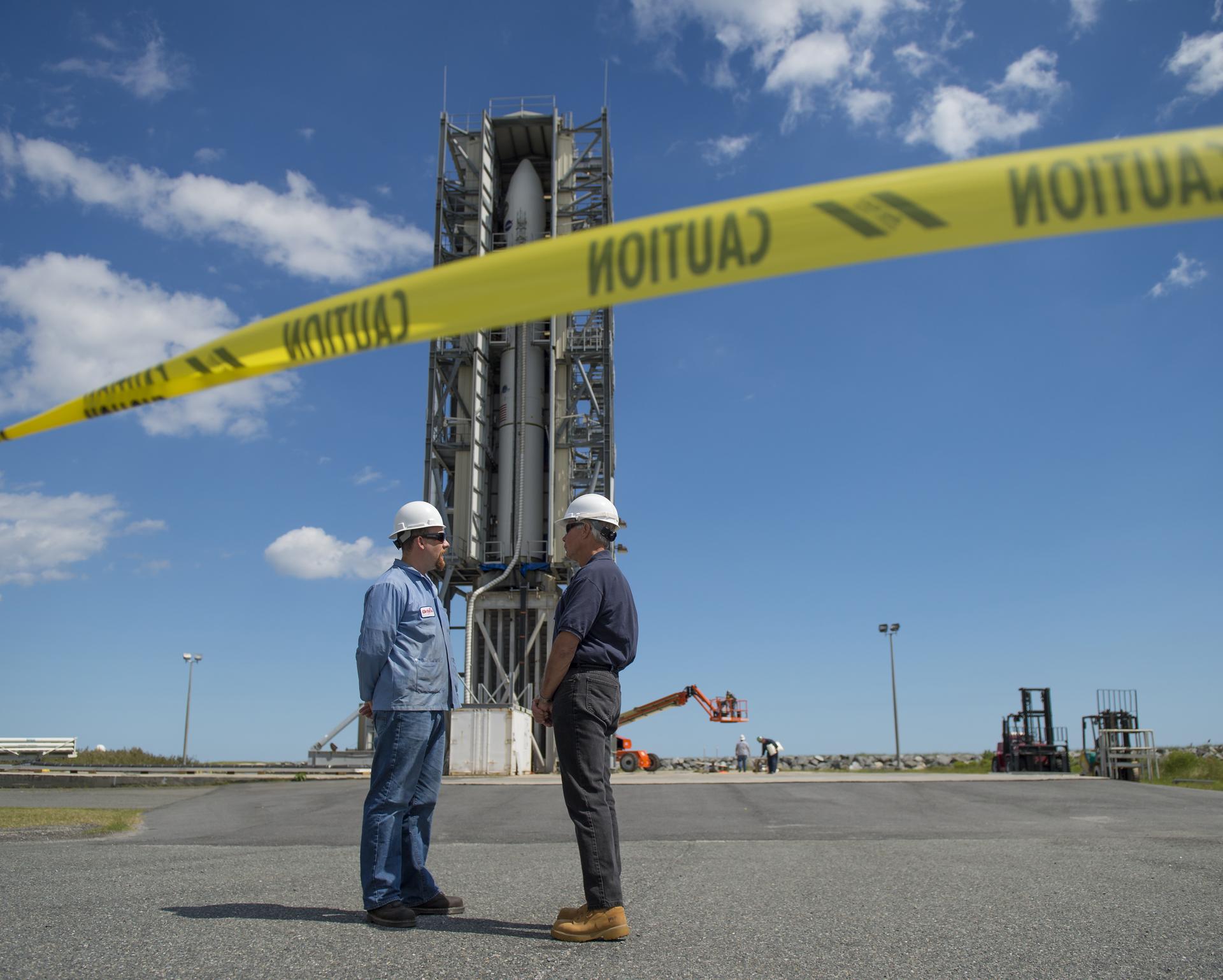 The doors of the gantry support structure are opened to reveal the Minotaur V rocket on Pad 0B at the Mid-Atlantic Regional Spaceport (MARS) at NASA's Wallops Flight Facility, Friday, Sept. 6, 2013 in Virginia. The Minotaur V will launch NASA's Lunar Atmosphere and Dust Environment Explorer (LADEE). LADEE is a robotic mission that will orbit the moon where it will provide unprecedented information about the environment around the moon and give scientists a better understanding of other planetary bodies in our solar system and beyond. LADEE is scheduled to launch at 11:27 p.m. Friday, Sept. 6, from NASA's Wallops Flight Facility. Photo Credit: (NASA/Carla Cioffi)