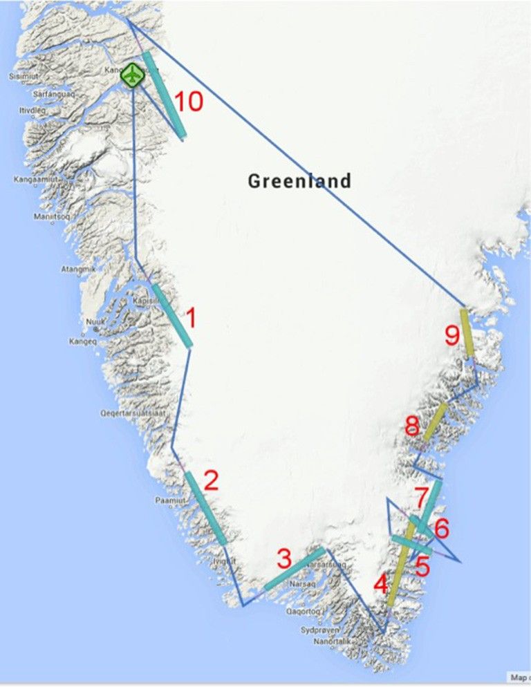 Image of Greenland detailing the NASA G-III flight plan